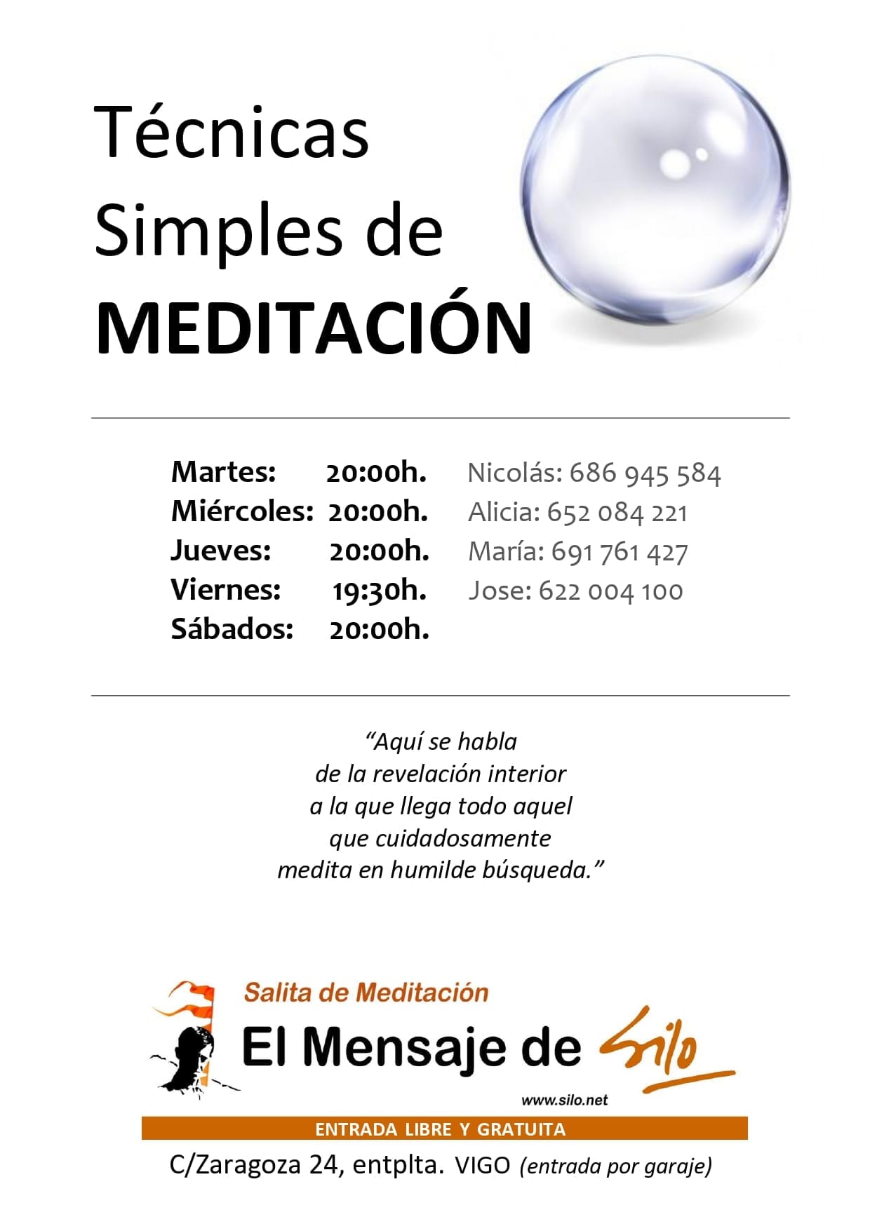 Martes 20:00 h. – 686 945 584 (Nicolás)Miércoles 20:00 h. – 652 084 221 (Alicia)Jueves 20:00 h. – 691 761 427 (María)Viernes 19:30 h. – 622 004 100 (Jose)Sábados 20:00 h.