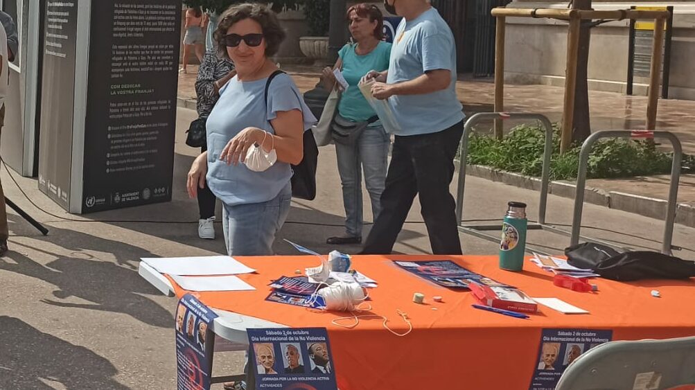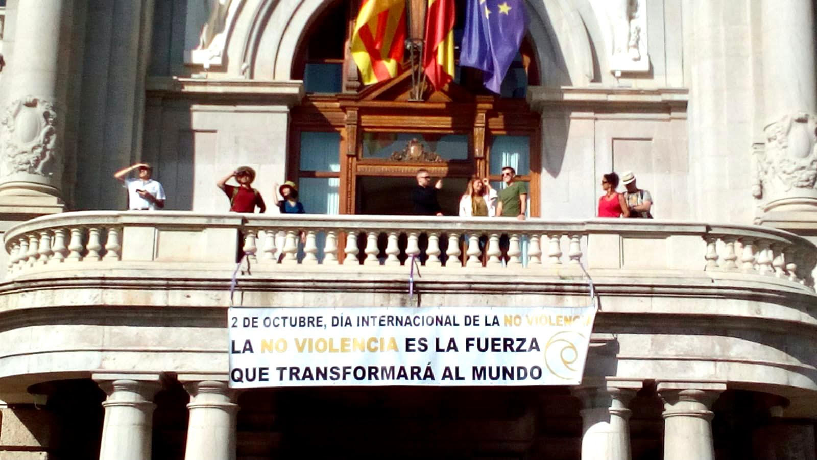 Durante los días 3 y 4 de octubre preside el balcón del Ayuntamiento de Valencia una pancarta con el texto: La No Violencia es la fuerza que transformará el mundo.